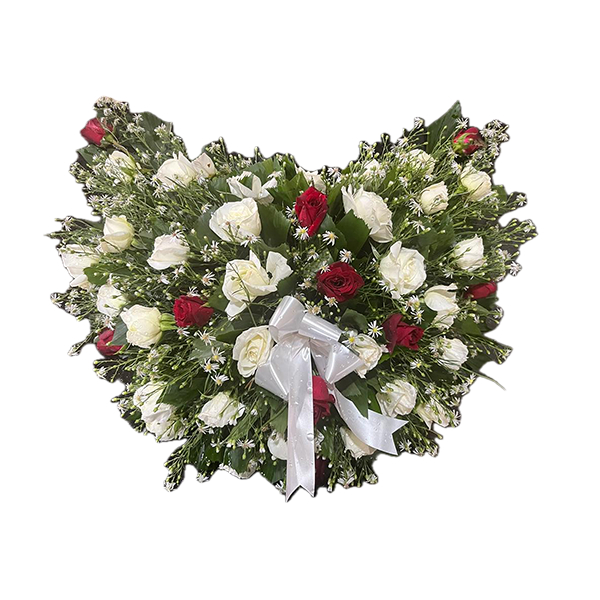 This funeral crescent to keep near the foot includes 25 white roses and 10 red roses