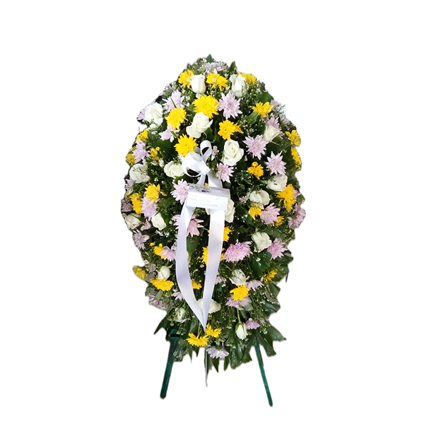 This funeral wreath includes 20 white roses and 30 mix color chrysanthemum flowers