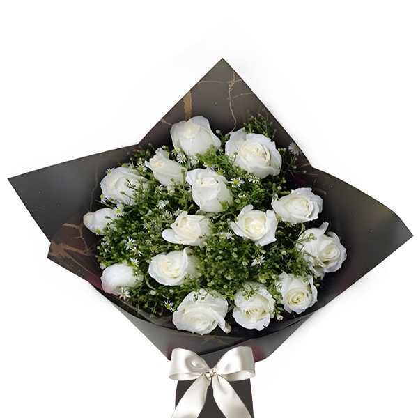 This bouquet comes with 15 white roses with a black wrapping and white ribbon.