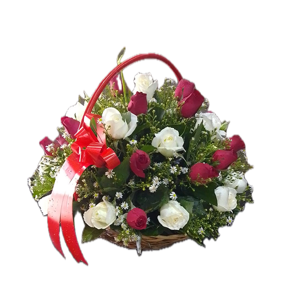 This basket includes 17 white roses and 18 red roses in cane basket.