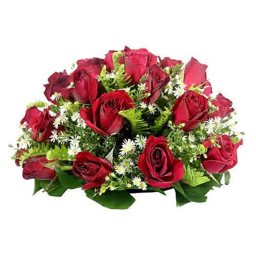 This funeral posy includes 18 red roses