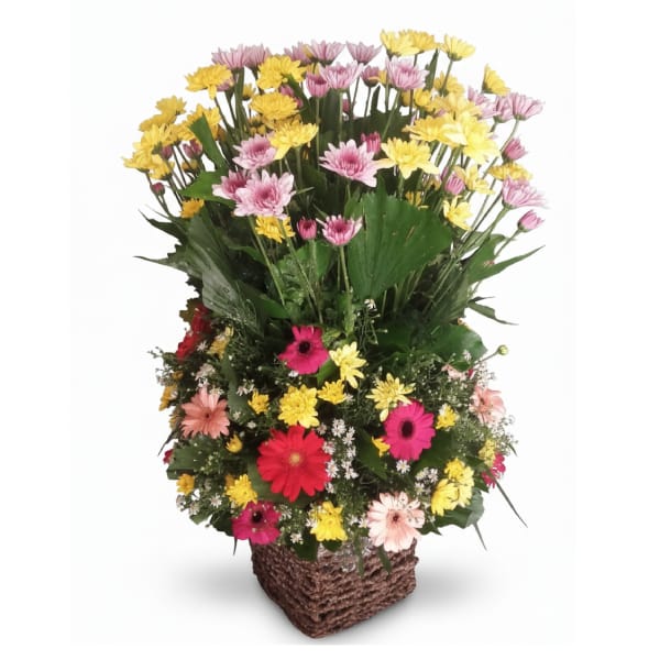 Searching for a large, dramatic floral arrangement ? The “Sunset Symphony” is an unforgettable choice. This tall flower arrangement features an abundant mix of 25 gerberas and 32-35 chrysanthemums in a unique kithul box. Perfect as an event centerpiece, a grand sympathy tribute, or a luxury gift, it’s often sought as a “large gerbera and chrysanthemum arrangement,” “rustic box floral display,” or “tall funeral flowers.” Its impressive size and warm, sunset colors make it ideal for honoring a life, celebrating a milestone, or
